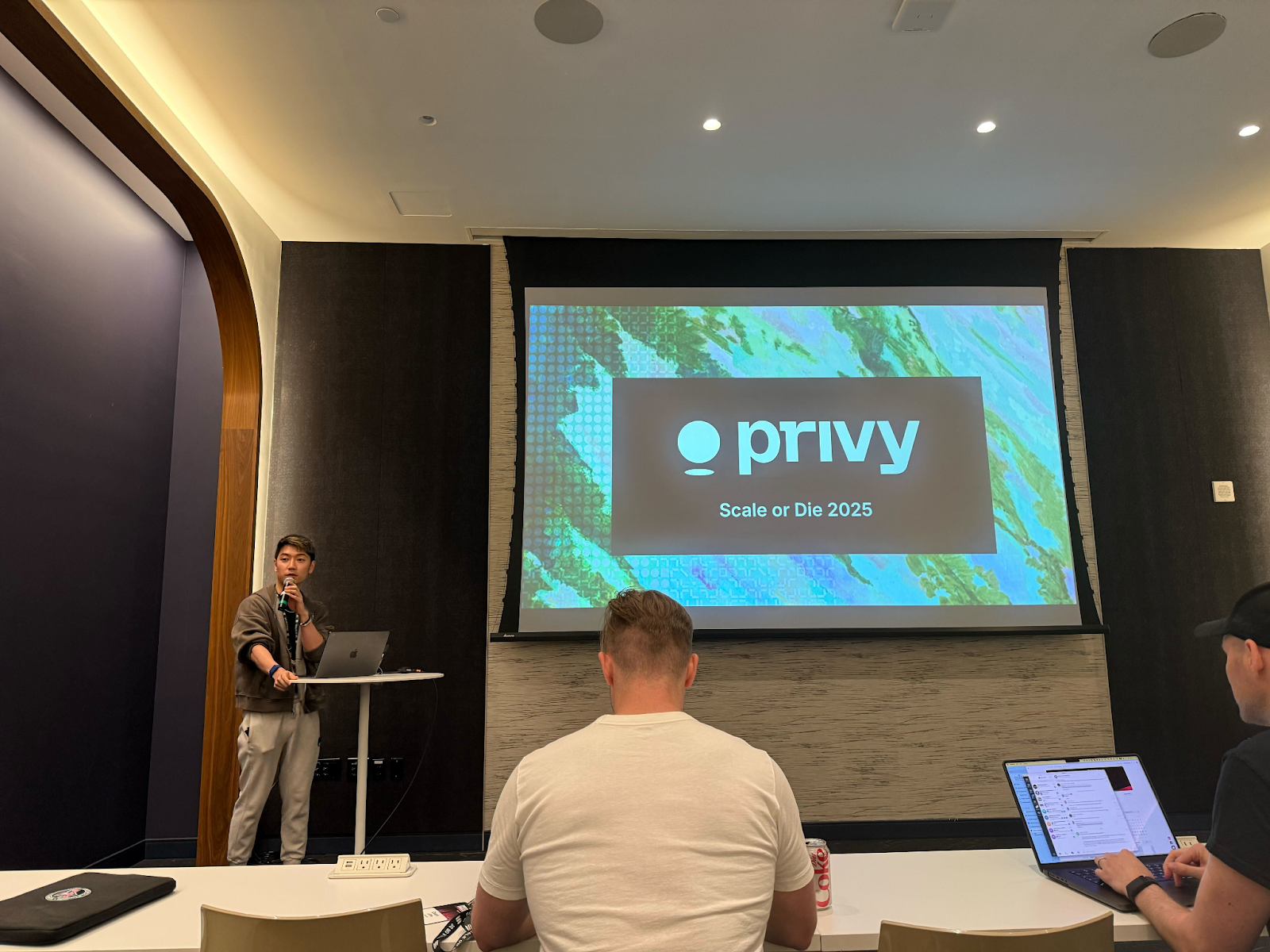 Following the core SRS presentation, Privy took the stage and showed how its wallet onboarding will tie into the SRS. Their embedded wallet framework allows for one-click onboarding across dApps while abstracting away key management.